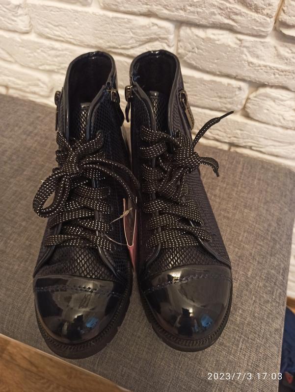 Новые ботинки на девочку с биркой. Размер 34. Стелька не вынимается, примерно 22 см (измерила настолько точно, насколько смогла, погрешность может быть в несколько мм). Темно-синего цвета. Сезон - весна-осень. Внутри мягенькие, ножке будет тепло. Застегиваются на молнию + шнурки (красивые, с блестящей нитью). Носок и задник ботинок лаковые, а середина сделана под рептилию. С внешней стороны украшены молнией-обманкой (не расстегивается). Не тяжелые, удобные и на ножке смотрятся стильно и аккуратно!