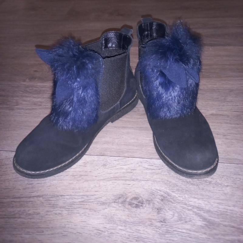на фото відблиски замшу та хутра, вони одного кольору темно сині, замш натуральний, в середині трішки утеплені, устілка 23, 5см, не на вузьку ногу
