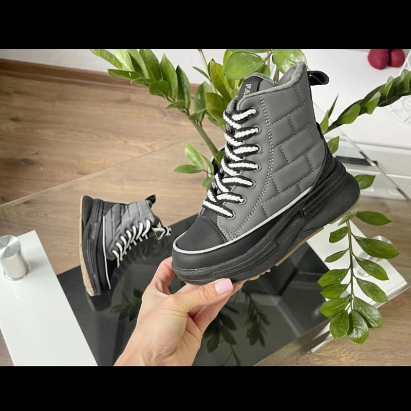Верх якісна еко шкіра. Всередині утеплені м'якесеньким плюшем. Устілка шкіряна з супінатором. Збоку є замочок. ЧОРНО-СІРІ 34 розмір 21,7 см ЕС
