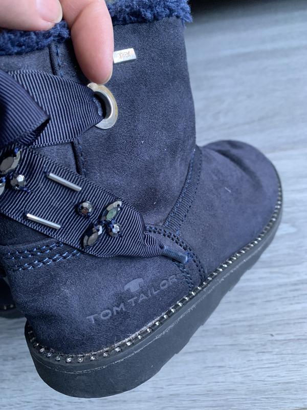 Демісезонні чоботи уги Tom Tailor 32 розмір зі щільного екозамшу 33 розмір, ззаду прикрашені бантами. Зношування несуттєве, не збиті, не счосані. Підійдуть на ніжку 33-го розміру, устілка 21 см.