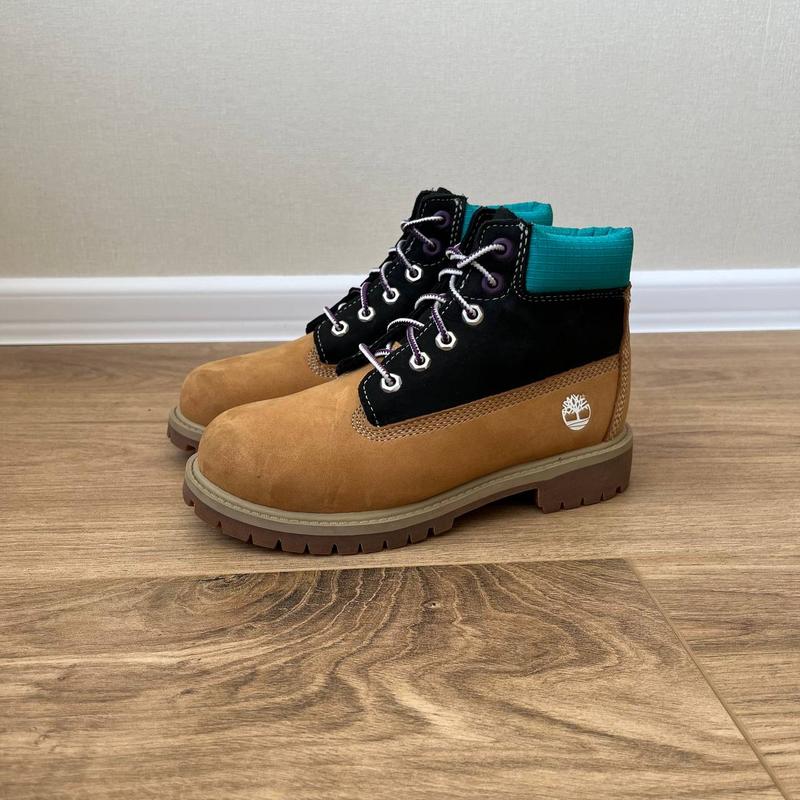 Очень крутые сапоги от Timberland, премиальной серии. Изготовлены из качественного нубука двух цветов с влагостойкой отделкой. Вставки из яркого, бирюзового нейлона. Внутри утеплитель Primaloft ( плотностью 200 грамм). Сбоку нанесен белый логотип, имеют высокую и долговечную подошву. Стильные, удобные, водостойкие - отличный вариант на осень. Состояние: идеальный. Цена новых в интернете от 3600 по скидкам и 6000 по полной цене. Размер EUR 33/US 1.5 (20.5 cm)