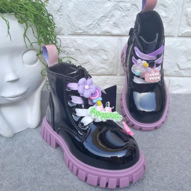 Apawwa, дуже гарнюні🥰, верх лакована еко-шкіра, всередині утеплені флісіком, регулюються шнурками та замочком, дуже гарні прикраси на шнурках(знімаються). 21р устілка 13,5см 22р устілка 14,3см 22р устілка 14,3см 23р устілка 14,8см 23р устілка 14,8см 24р устілка 15,3см 24р устілка 15,3см 25р устілка 15,8см
