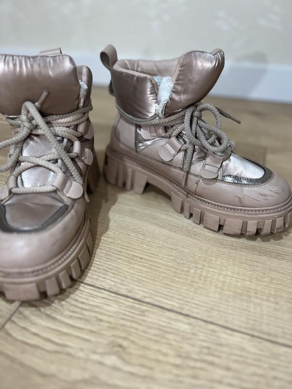 Очень классные теплые зимние ботинки на меху, носила девочка подростосток, буквально несколько недель. Есть потертости (особенности походки) Размер 38, на стельку 24 см