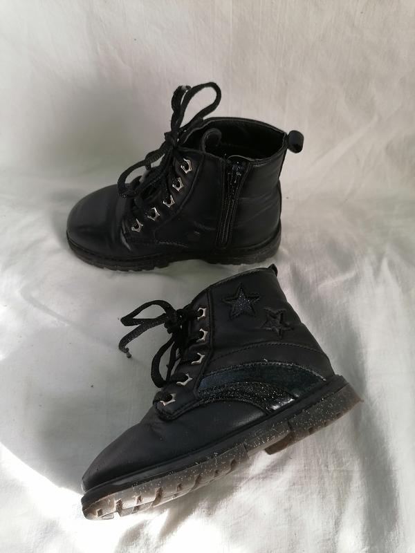 Ботинки на девочку из эко-кожи. Силиконовая подошва с блестками. На тоненьком поролоне. Есть маленькие царапинки на носочках, немного примяти. Написанный размер 28. Длина стельки 18 см. На все вопросы с радостью ответят, при необходимости отправь дополнительные фото и замеры.
