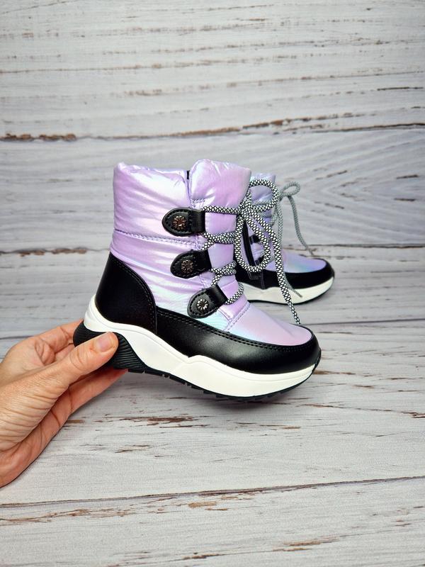 Зимние ботинки дутики фирмы Apawwa Артикул: D1003 фиолетовый Сезон: зима Цвет: фиолетовый Материал внутренний: густой смешанный мех 60% шерсть/овчина Материал наружный: качественная плотная экокожа и водонероникная плащевка. Стильные и невероятно яркие дутики, мягкие, гибкие. Очень стильно смотрятся на ножке По объему регулируются шнуровкой со стороны для удобства молния" Размеры по стельке полностью: 27р. по стельке 17,8 см