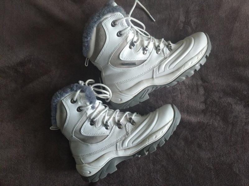 Качественные спортивные зимние кожаные ботинки Restime,р.36. Цвет - белый,серый . Обувались одну зиму ,и то иногда, с машины в машину. Состав- натуральные материалы,густой мех . Длина стельки на фото показано 23.5 см.