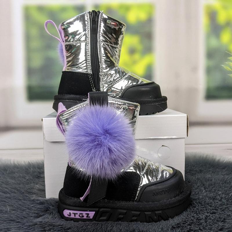 Сапоги дутики детские для девочки серебристые с меховым помпоном paliament 1883