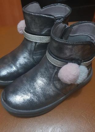 Ботинки "Felicita" для девочки, 26 размер - стелька 16,5 см. Natural Footprint® – физиологическая стелька, разработанная в обсерватории Chicco, способствует естественному развитию стопы; плотный задник правильно фиксирует ногу ребенка; застегиваются на боковую "молнию". Подошва из термопластичной резины. Немного сбитые носочки - видно на 2 фото. В целом состояние очень хорошее. Пересылаю.