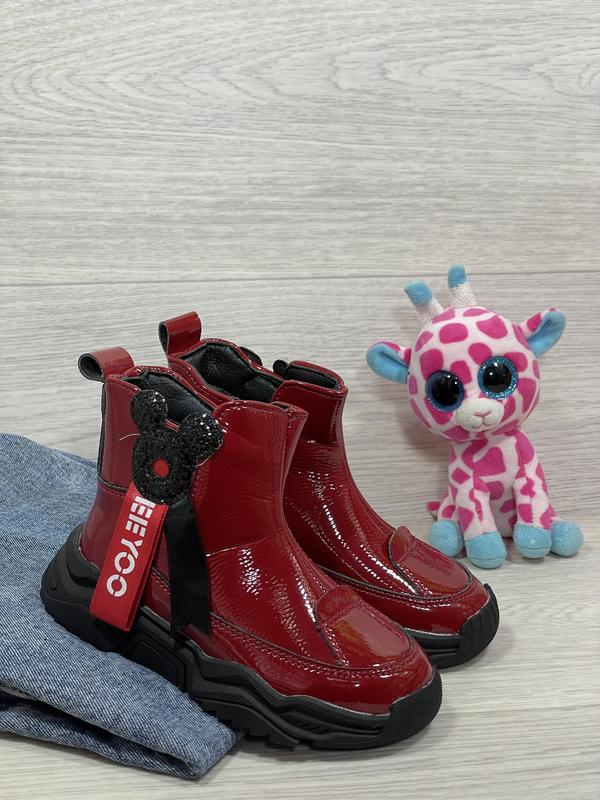 Стильные ботиночки для ваших принцесс Выполнены из качественных эко материалов Верх-эко лак Внутри утеплённые плюшем Застёжка змейка Размерный ряд 26-31 28-17 см 29-17,5 см 30-18,5 см 31-19 см