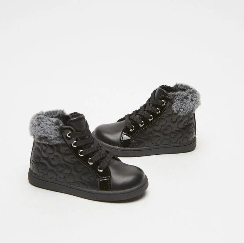 Верх изготовлен из высококачественной искусственной кожи. В середине подкладка и стелька из микрофлиса. Хорошо фиксируют ножку благодаря молнии сбоку и шнуркам спереди, на любую полноту ножки. Зверху прикрашені штучним хутром. Материал: искусственная кожа, текстиль, резина. Стан на фото . Размер 25 р По стельке 16 см