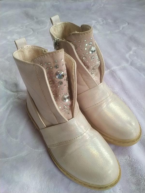 Черевики в ідеальному стані. Пошкоджень і дефектів немає. Дуже гарно виглядають на нозі,пудрового кольору,всі камінці на місці. 18 см по стельці