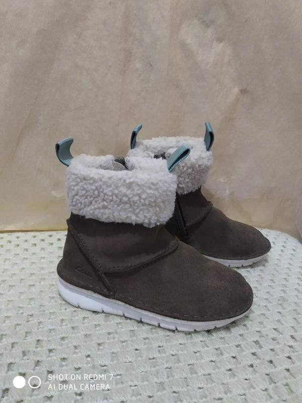Кожаные ботинки Clarks First Shoes в идеальном состоянии, верх обуви натуральная замша, мех, в середине мех текстиль Длина стельки 15,6см, ширина 6, 5см Отсылаю накладным платежом при предоплате 150 грн или безопасной оплатой с оплатой через сайт, только новой почтой Укр по почте только при полной предоплате на карту