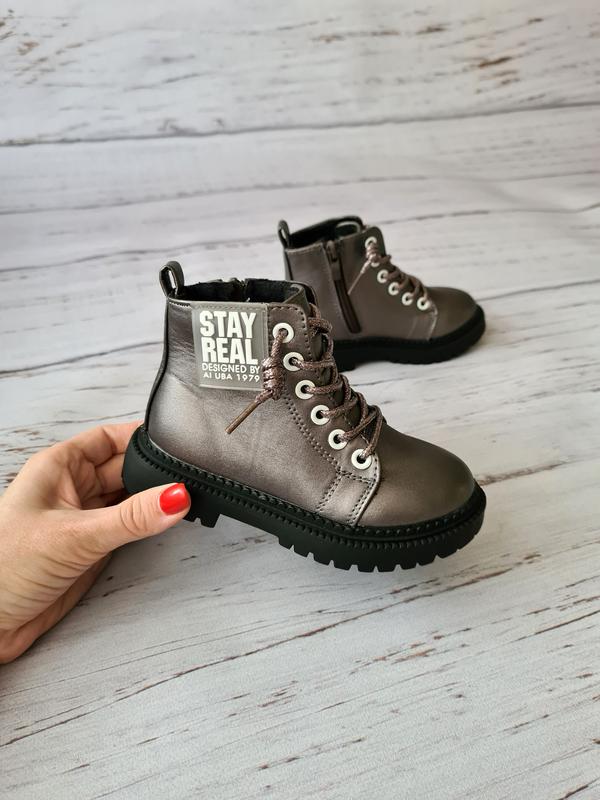 Черевики/тимбі для дівчаток Bbt Сезон: весна-осінь Колір: бронза Матеріал внутрішній: мікрофлісова устілка, підкладка мікрофліс Матеріал зовнішній: штучна шкіра Стильні черевики, м'які, гнучкі. Оснащені високим задником. Підійдуть на високий підйом і стандартну ніжку. За обсягом регулюються шнурками та блискавкою. Кожна пара йде коробці Розмір по устілці повністю: 24р. по устілці 14,5 см 24р. по устілці 14,5 см