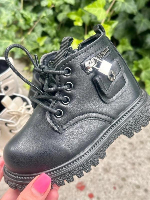 Эко кожа, внутри текстиль, застегиваются на молнию и имеют шнуровку. Очень легкие и удобные. Купили осенью 2023 года. Продаем потому, что маленькие стали за зиму. Без каких-либо дефектов, очень аккуратные Размер 27 - 16,5 см