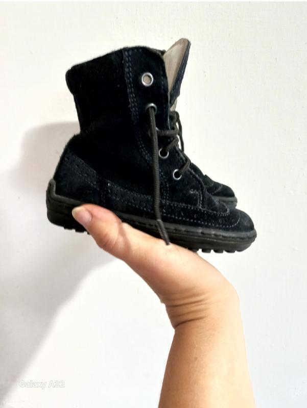 Ботинки для девочки темно-синего цвета из натуральной замши, внутри натуральная кожа, удобные и легкие, подошва не скользкая. На носочках немного потерто замша ( на фото кажется сильные потертости но в жизни значительно меньше). Размер 22