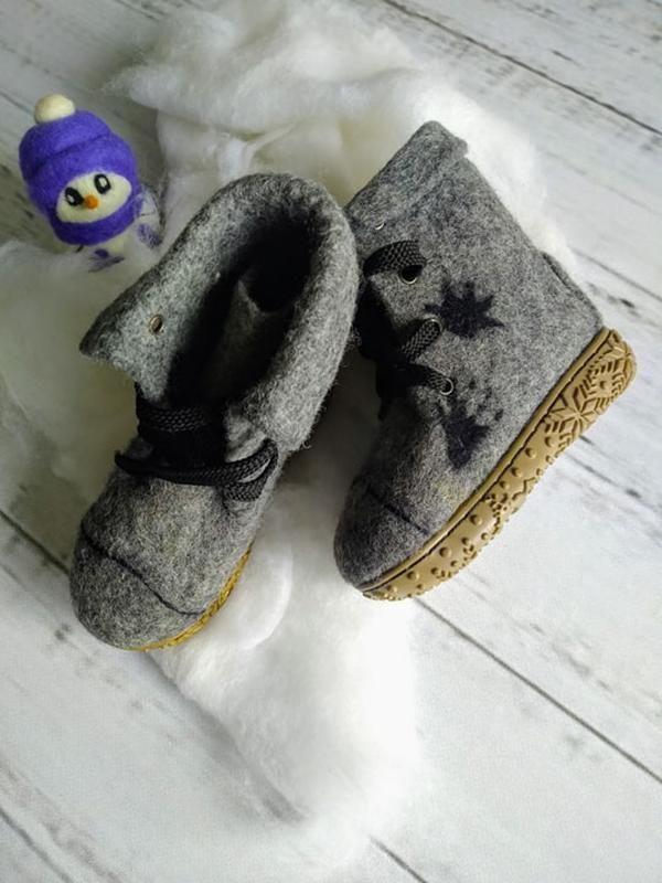 Валянки дитячі виконані з натуральної вовни, проклеєні і підшиті. Носок і п'ята додатково укріплені повстю.