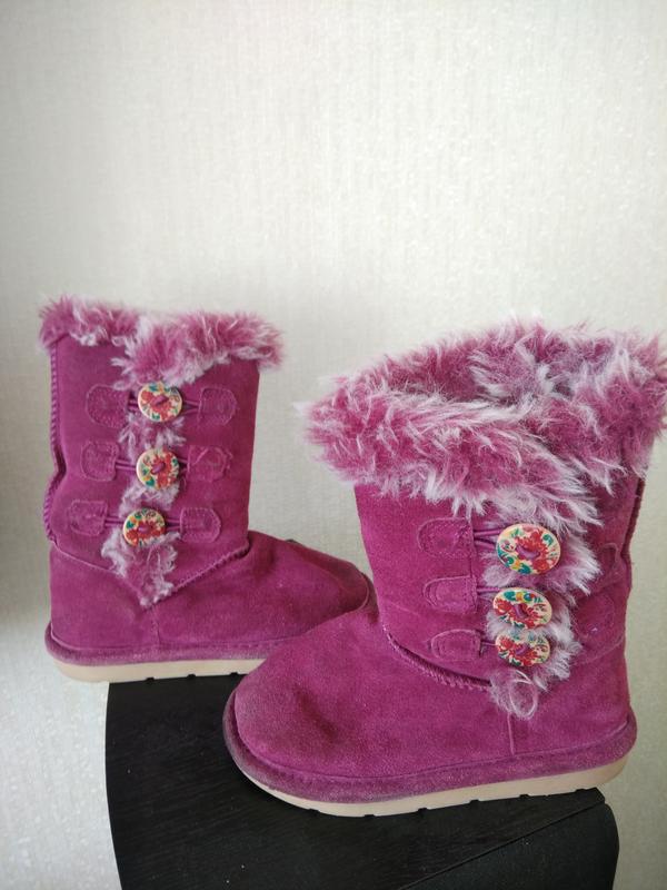 Сапоги угги в хорошем состоянии 18 см по стельке. Указан 9 размер. Материал натуральная замша, мех искусственный но тёплый. Застегиваются на 3 пуговицы.
