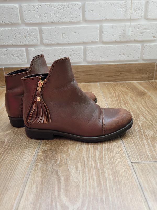 Ботінки Geox (Італія) виконані із натуральної шкіри, всередині підкладка: натуральна шкіра/ войлок та м'яка войлочна устілка, запатентована підошва, що дихає Geox Respira зі спеціальними отворами, виводить вологу назовні, не пропускаючи її всередину . Застібка - бокова змійка. Колір коричневий. Розмір 32 - довжина устілки 21 см. Сезон - демі. В гарному стані, носики можна підфарбувати коричневою фарбою.