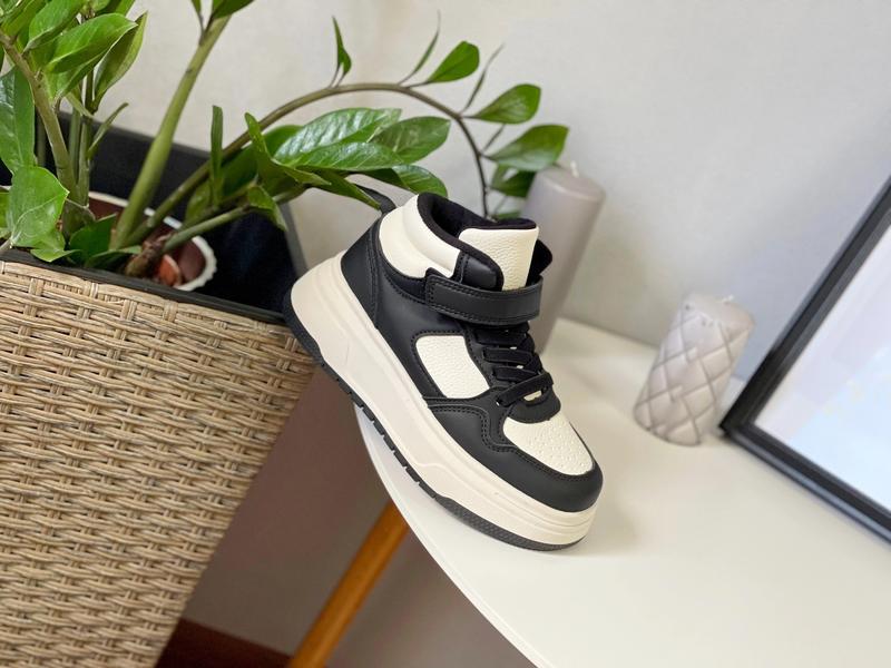 Стильные хайтопы для мальчиков и девочек Снаружи качественная эко-кожа Внутри плюш Шнуровка -резинка Фиксация липучкой цвет черный с белым ЦИНА 930 34 размер 21.7 см