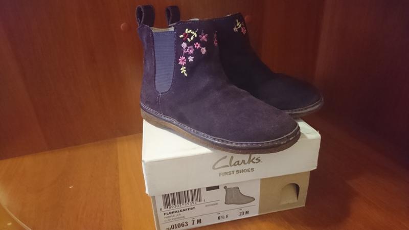Продам замшевые ботиночки на девочку Clarks. Очень красивые, с вышивкой. На замочке, удобно надевать. Стелька кожаная. Взули один раз. Стелька 15,5 см, не вынимается. Истинный идеально на ногу до 15 см, что бы на носочек хорошо садились.