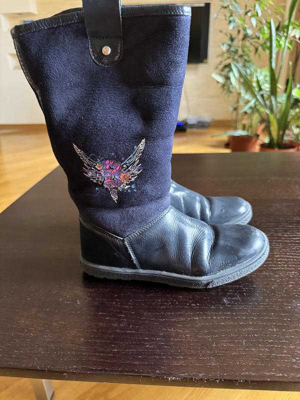 Синего цвета, кожаные на цигейке. Нюанси на фото. На среднюю и на узкую ножку.