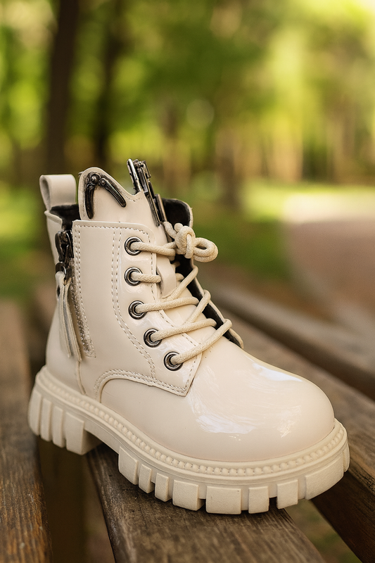 РАСПОРЯЖЕ ОСТРЕБЛЕНИЯ ПАРА Ботинки теплые стильные детские бежевые для девочки, демисезон,штучная лаковая кожа, внутрь искусственный мех,на замочке, застежке,на шнурках,подошва резина,легкие