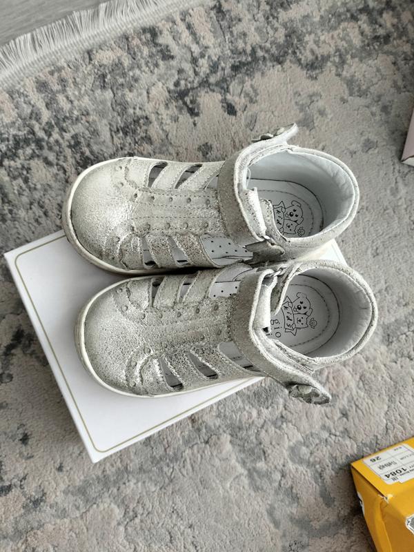 отличные кожаные босоножки для девочки 24 размер, 14.5 см стелька. состояние идеальный, цвет серебристый, и подошва тоже предлагаемая как будто серебро, фото не передает.