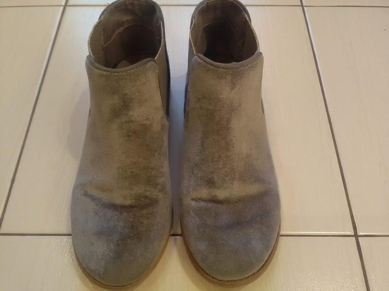 Тренд этого сезона бархатные ботиночки от Zara. Цвет пудрово-серый с добавлением золотистого блеска. По бокам вставлены золотистые резинки. Набойки только сменили. Из недостатков немного счесан цвет на каблучках. Стелька 22 см