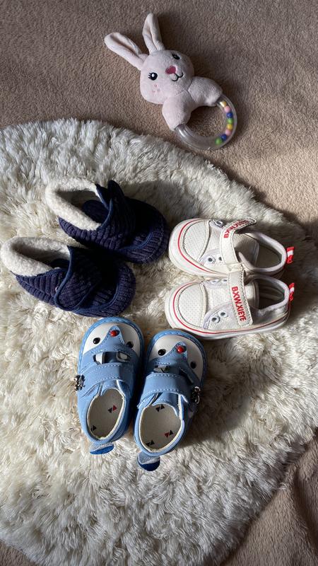 Бежевые кеды: верх светло-бежевого цвета с красной окантовкой по краю подошвы и надписью на липучке. Подошва белая, а застежка липучка облегчает надевание. Весь дизайн выглядит удобным и стильным🤗 Размер: 15 Вторые тапочки имеют темно-синий цвет и утепленные изнутри, скорее всего, мехом или мягкой тканью. Они предназначены для холодной погоды, с мягкой и теплой внутренней частью, а также удобно надеваются на ножку🤗 Размер: на 18-25 мес Голубой сандалии: эти сандалии выполнены в светло-голубом цвете с декоративными элементами, такими как кнопки или узоры. Та маленький колокольчик-колколкольчик🤗 Размер: 16 Цена указана за три ботиночки🥰 Также можно приобрести отдельно🤗