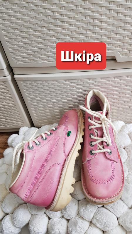 Качественные кожаные ботинки от Kickers. Замеры: стелька 23, ширина 8, объем 12, высота ботинка 9.5 см. Берите с запасом потому что у меня стопа 22.5, но при движении большой палец начинает упираться, то есть брать где-то на 22. Нюансы на последнем фото - белый кожзам треснул, он по типу толстой клеенки, не облезает, держит форму. Есть потертости и испачкания кожи (теж см.на фото). Во всем остальном в хорошем состоянии, функциональных дефектов нет, подошва целая.