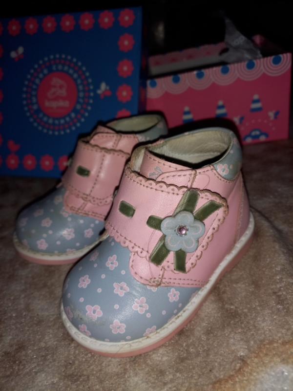 Черевики сіро-рожеві з натуральної шкіри в гарному стані. Розмір 18, устілка 11см. З нюансів є подряпини на носках - на фото видно, але вони малопомітні за рахунок кольору.