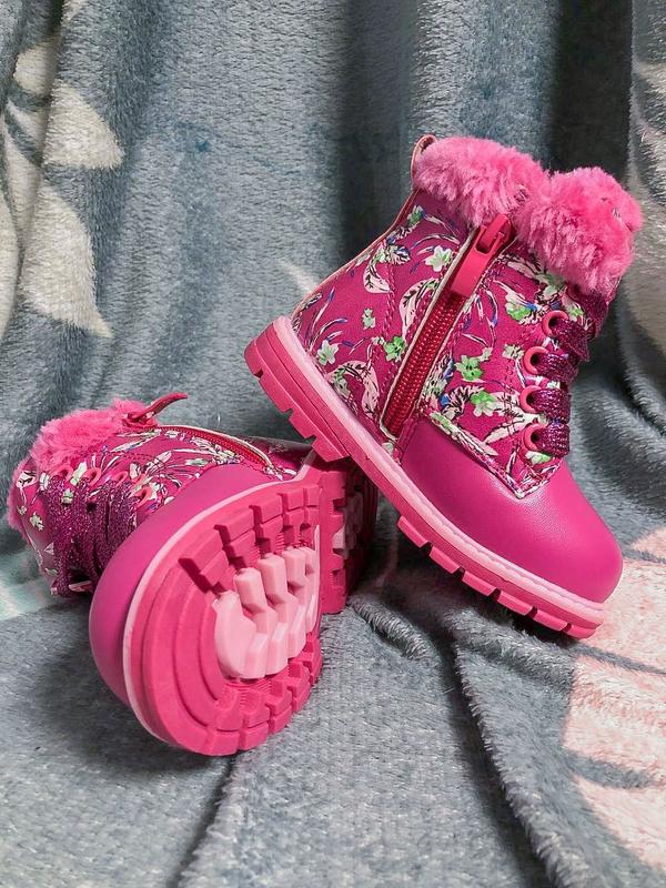 Новые детские зимние ботиночки на меху из качественного кожзама. Цвет розовый, по бокам вставки с рисунком розово-зеленых цветов, с розовыми декоративными шнурками и удобной молнией, а так же нескользящей подошвой. Размеры 24 15 см 25 16 см