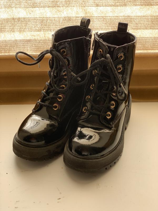 Красивые лаковые ботинки на девочку осень весна. Сбоку на молнии, спереди на шнурках. Из дефектов чуточку спереди сарапины, но при носке они не заметны, на фото видны дефекты.
