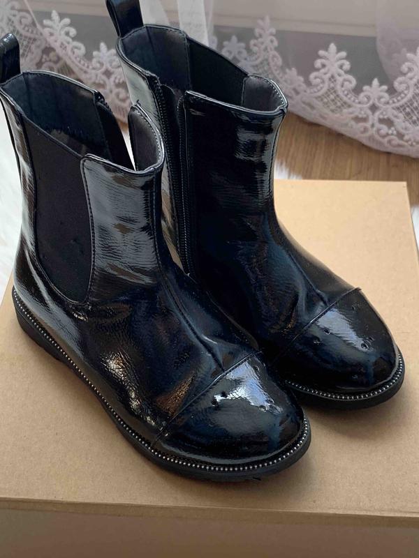 Челси для девчики, 30 р Спереди была пряжка, оторвалась. Можно поставить другую Не протекают Лак качественный, не подертый, мягкий Высота 15,5 см, по по потолке около 19,5 см. В середине легкая байка