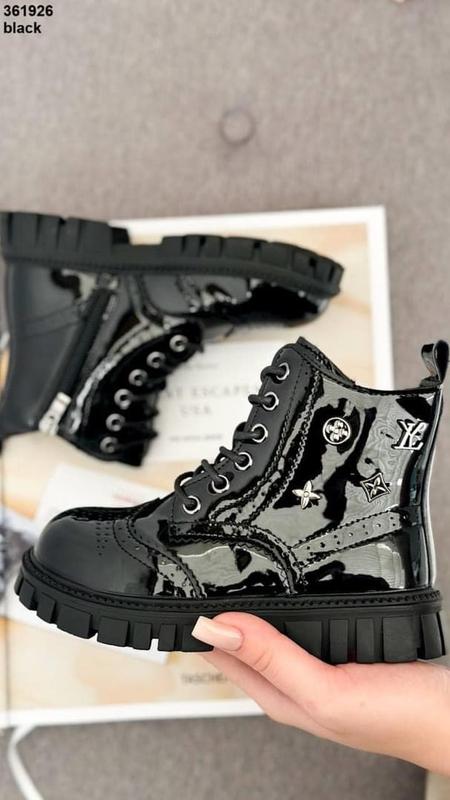 Мега стильні зимові черевики для дівчаток Якість на висоті. Верх якісний еко лак. Всередині густе тепле хутро Фіксація шнурівка Збоку є замочок. Легенькі та зручні. Розміри: 27.-16.5 см 29.-17.5 см 30.-18 см Модель маломірить
