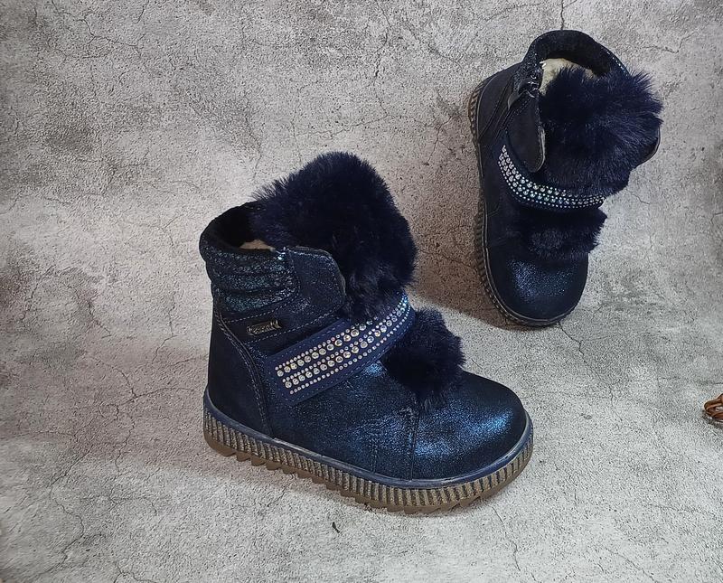Зимние ботиночки для девочки Мех можно убрать. Цвет синий перламутр. Верх еко-шкіра. Фиксация липучкой, сбоку на замочке Внутри набивная овчина 60% натуральная. Очень теплые и легкие! Нескользящая подошва. Замеры стельки: 25 - 16,1 см