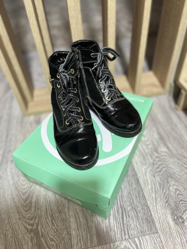 Кожаные ботинки с замшевыми вставками. На шнурках и замочке. Внутри флис. Размер 33, стелька 22 см, высота каблука 2 см.