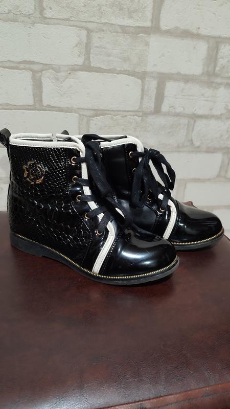 Лаковые демиботинки на девочку в идеальном состоянии. Размер 35. Стелька 22 см. Внутри флис. Сбоку замочек. Есть одна царапина, на фото можно увидеть, но все остальное целое и никаких нюансов.