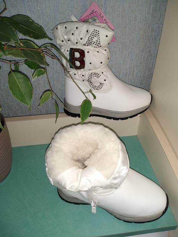 Сапожки зимові з перламутом фірми Lilin АКЦІЯ всередині овчинка тепленькі а ззовні замінник де носочок а зверху тіпа під балон або щось подібне дуже гарна моделька білі під шампань з перламутровим відливом розміри: 27рр-17.2см 28рр-18см