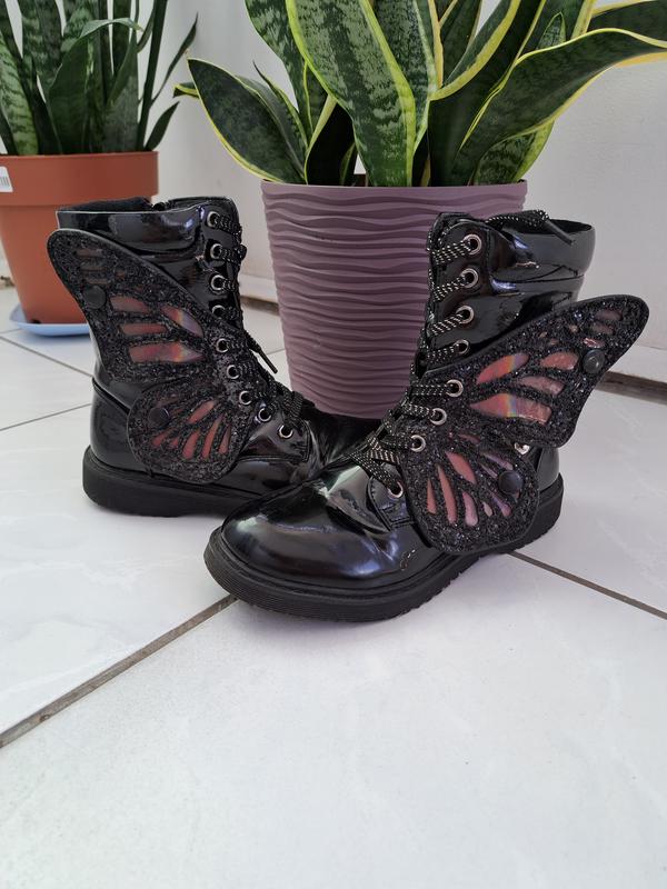 Очень крутые сапожки на девочку, в хорошем состоянии, есть молния и шнурки. Лаковые,с утепления. Демисезон. Крыльца бабочек можно снять или нет, они сверкают на солнце) очень эфекно)