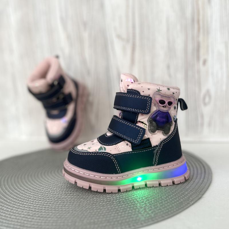 Зимние термо ботинки от TM Tom M с подсветкой☃️ Внутри утеплены овчиной 60% натуральной. Непромокаемые. Фиксируются двумя липучками. Язычок с защитой от попадания снега. Протекторная подошва. Размеры: 23-14,8 см 24-15,5 см 25-16 см (2) 26-16,7 см (2) 27-17,5 см 28-18 см