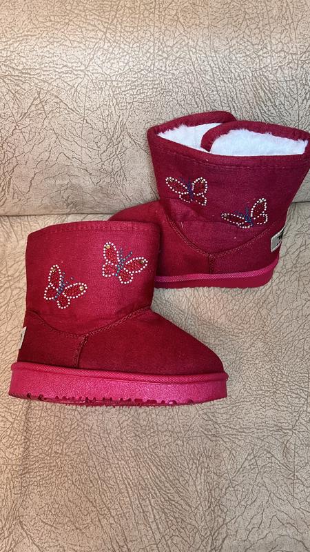 Угги малинового цвета зимние для девочек Новые. Принт с бабочками из бисера. Очень удобные, не тяжелые, и доступные в по цене. Размер 25 (15 см стелька)