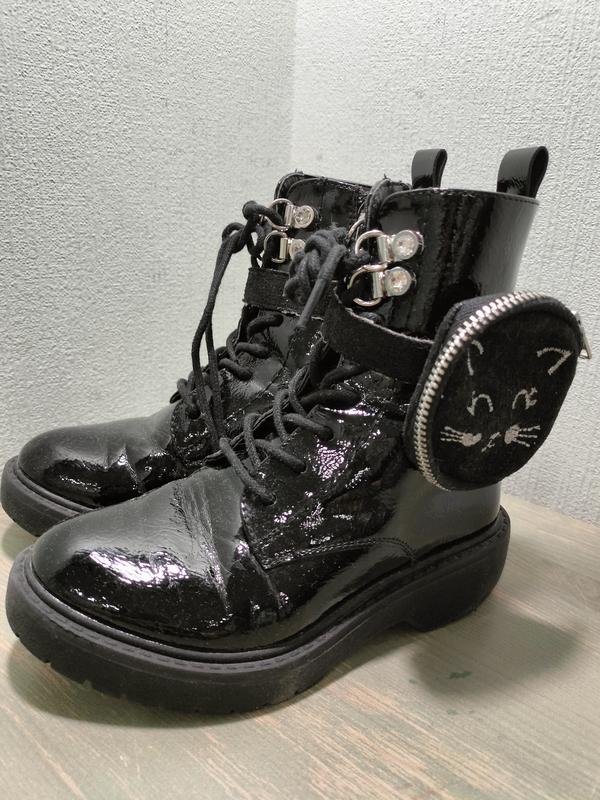 В дуже гарному стані демісезонні чобітки з штучного лаку на дівчинку 28р. Довжина устілки 18,5см. висота чобітка 16см.