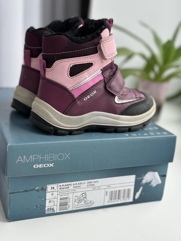 Дитячі зимові черевики Geox Flanfil 26 р чоботи дівчинці. Стан: на фото все видно Матеріал верху: штучні матеріали + текстиль. Всередині: штучна вовна + технологія Geox Amphibiox - це інноваційна технологія, яка надійно захищає від вологи та дозволяє дихати нозі. Не промокають Устілка: повсть Підошва: Термопластична гума - легка та міцна, з відмінним зчепленням. Посилений носок. Зручна система швидкої фіксації на 2 липучки. Відмінна модель для активних зимових прогулянок.