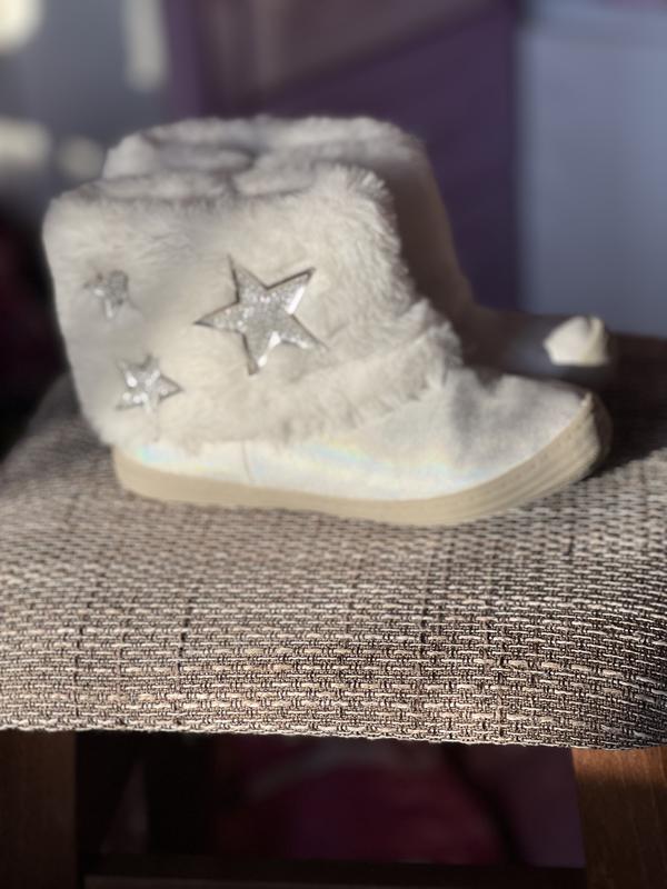 Ботинки после дочки. Фирма Cat & Jack. Размер 12. Размер устолько около 18.5-19 см. Стельки не вынимаются. Ботинки ребенок одевал в школу на праздник Рождества один раз. На улице не носились. Стан идеален. Сверху кожа, внутри текстильная подкладка. Белая меховая опушка. Красиво смотрятся под любой костюм. Могут подойти и девочкам, и мальчикам.