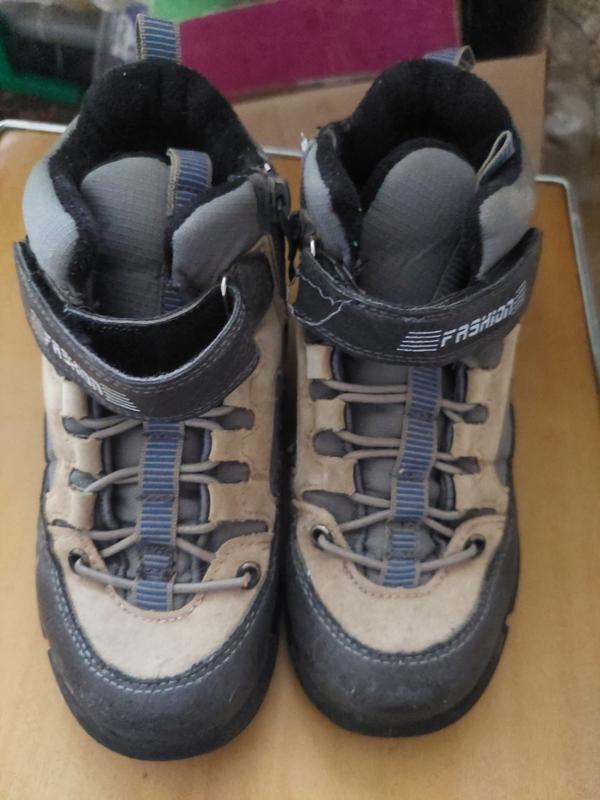 осенние ботинки в красивом состоянии, внутри флис. 31 размер, стелька 19см, сбовая замочек и липучка. липучка держит красиво. спереди чуточку щуть,але цего сильно не видно закремит. на двух последних фото показала недостатки