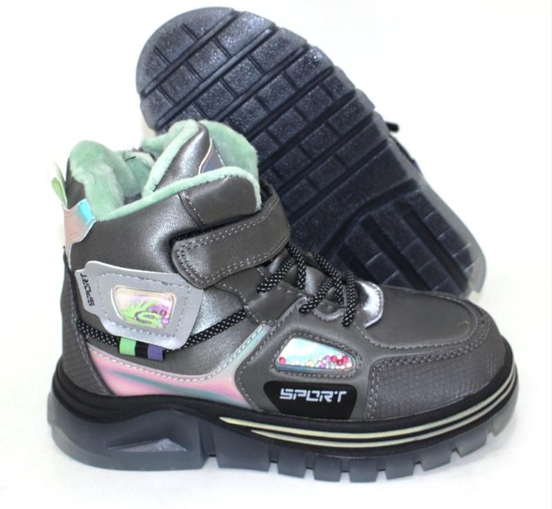 Детские зимние графитные ботинки на липучках с голографическими вставками