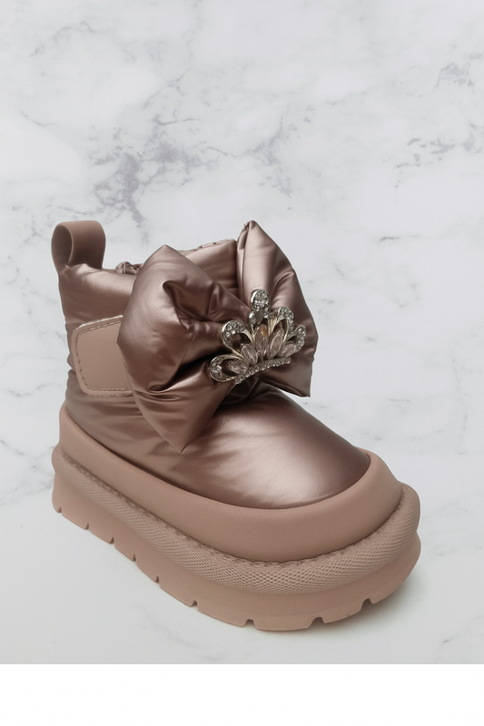 Дутики зимние детские для девочки розовые перламутровые с короной бантиком,на липучке и за...
