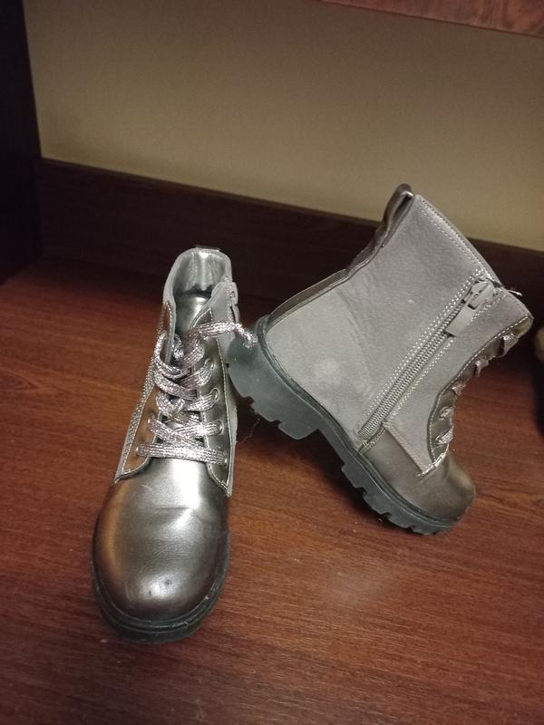 Красивые ботиночки на девочку. Размер 28 см по стельке 18 см. Состояние отличное, но на последнем фото видно носочки впереди- это очень маленькие точки которые вообще не заметны при использовании. Внутри утеплены флисом, замки работают и шнурки на мечте. Цвет красивый-бронзовый. Отправляю Новой и Укрпочтой.