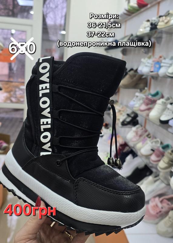 Черные зимние сапожки из водонепроницаемой ткани, стильный дизайн с надписью "LOVE". Доступные размеры: 36 (21,5 см) 37 (22 см). Цена: 320